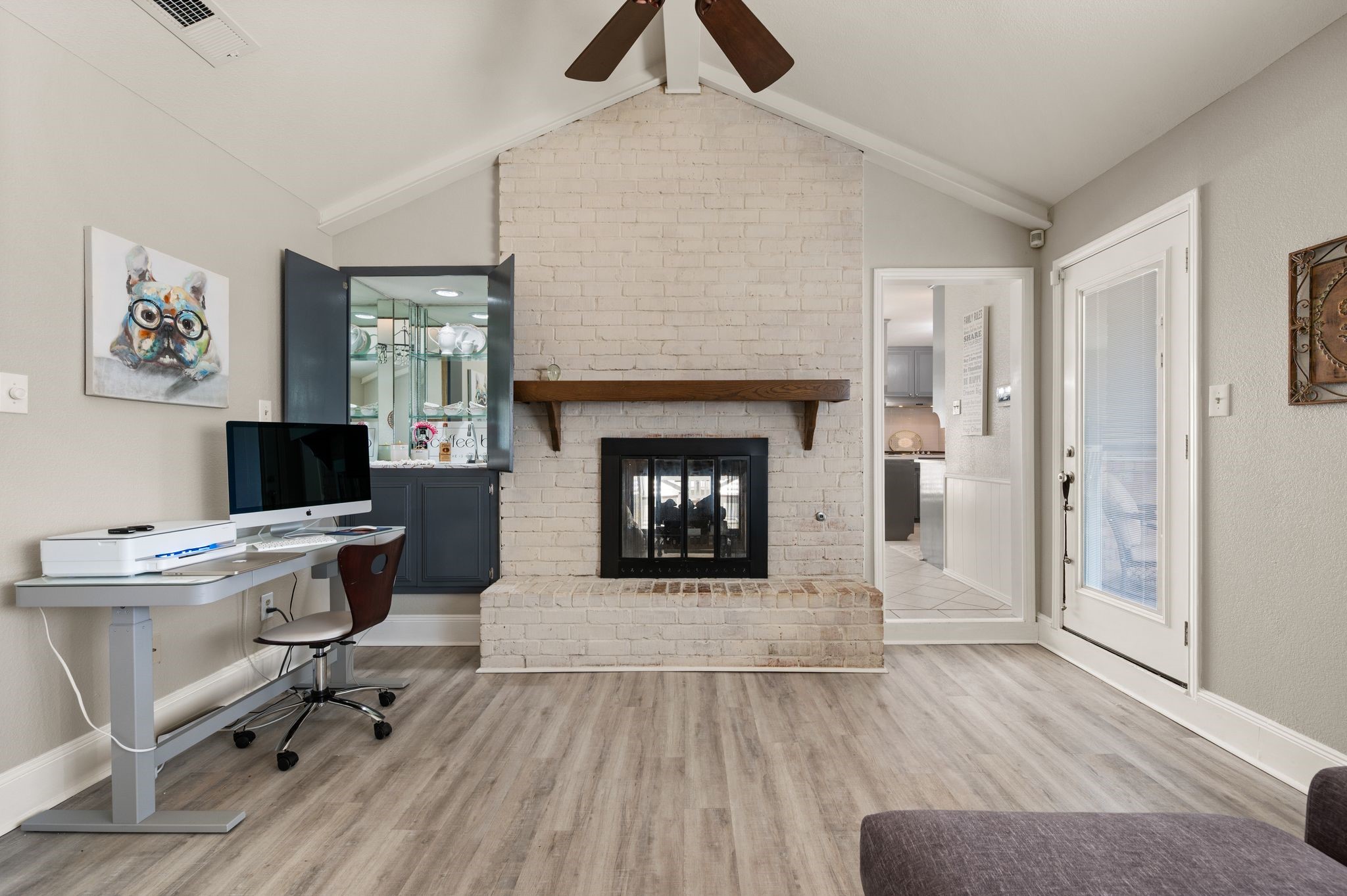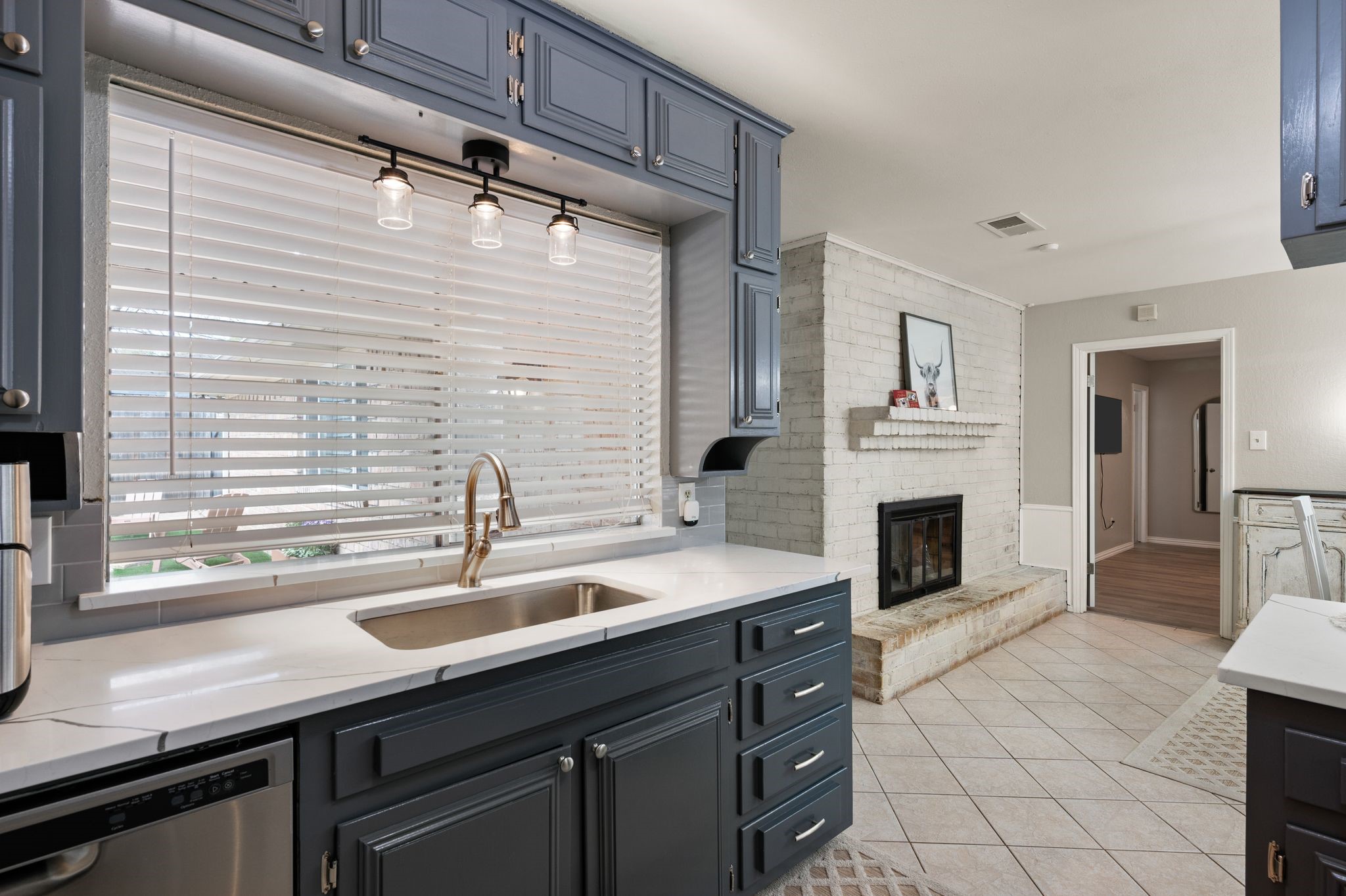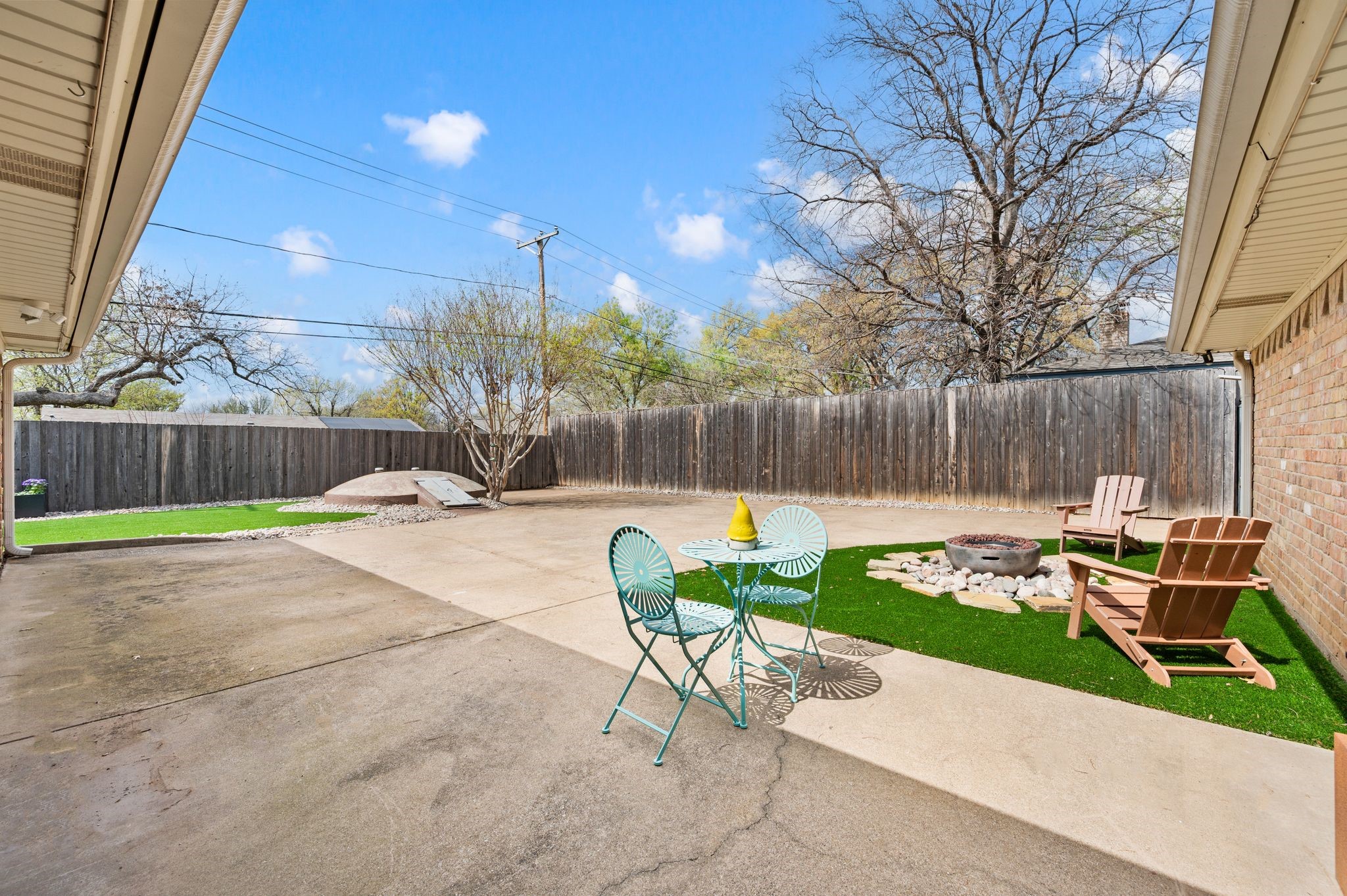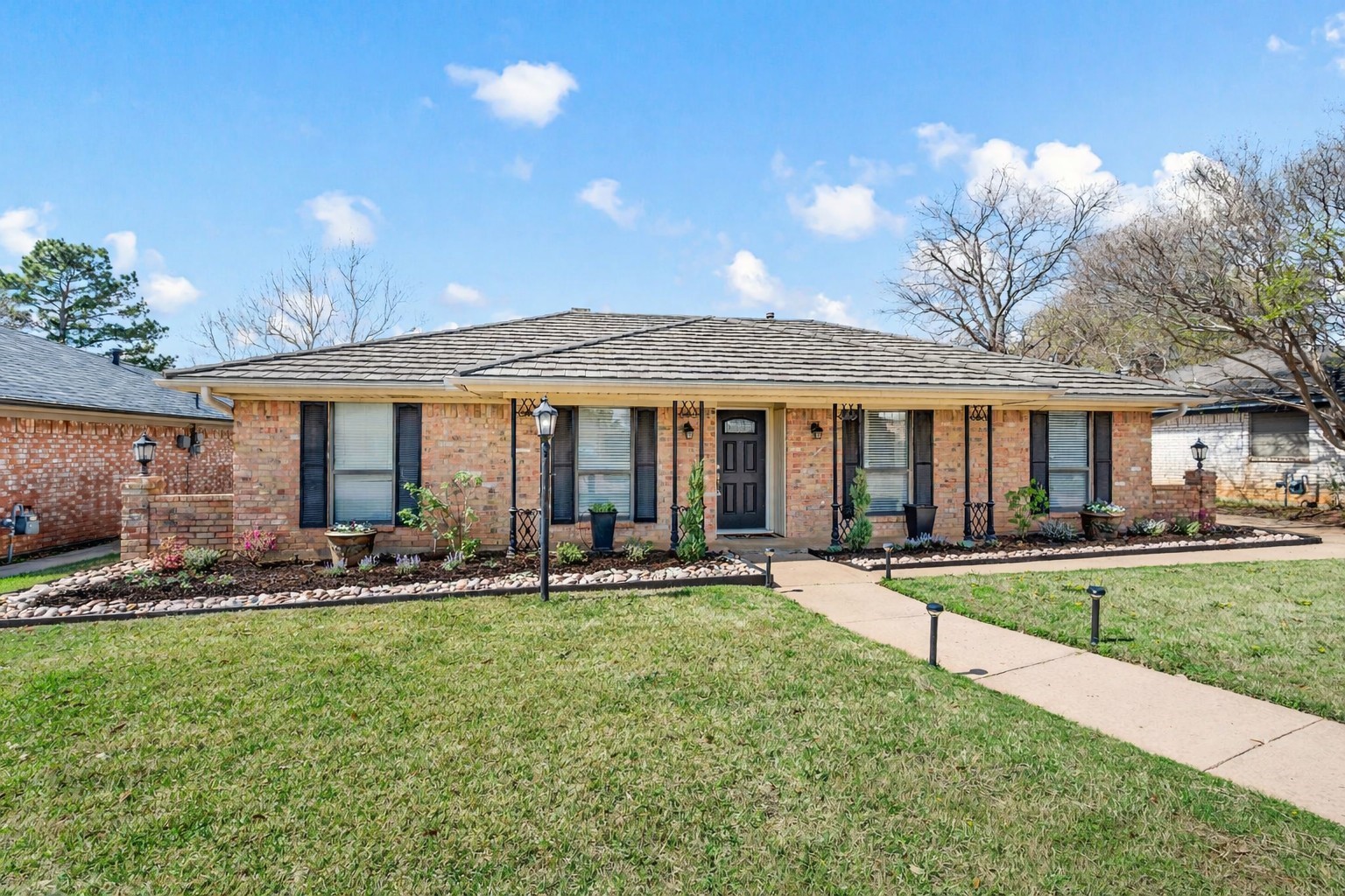 Welcome to this beautifully updated, truly turnkey one-story home nestled in the quiet and highly sought-after Mayfair community, just blocks from Chisholm Park and a variety of shopping and dining options. From the moment you arrive, fresh landscaping and a charming front porch create inviting curb appeal and the perfect place to relax while enjoying the lush green front yard. Inside, the home showcases stylish updates throughout, including new luxury vinyl plank flooring, fresh interior paint, and updated decorative lighting. The spacious living room is anchored by a stunning see-through brick fireplace that adds warmth and character while connecting the main living areas. The open eat-in kitchen shines with brand-new countertops, stainless steel appliances, and abundant built-in cabinetry that provides both functionality and generous storage. The thoughtfully designed split-bedroom floor plan offers privacy and flexibility for everyday living. Step outside to the covered patio, ideal for relaxing or entertaining, while overlooking the spacious backyard with newly added landscaping and fresh sod. Additional features include expansive private parking secured by an electric gate and the added peace of mind of a built-in storm shelter. Thoughtfully updated and completely move-in ready, this home blends comfort, style, and convenience in an unbeatable location.