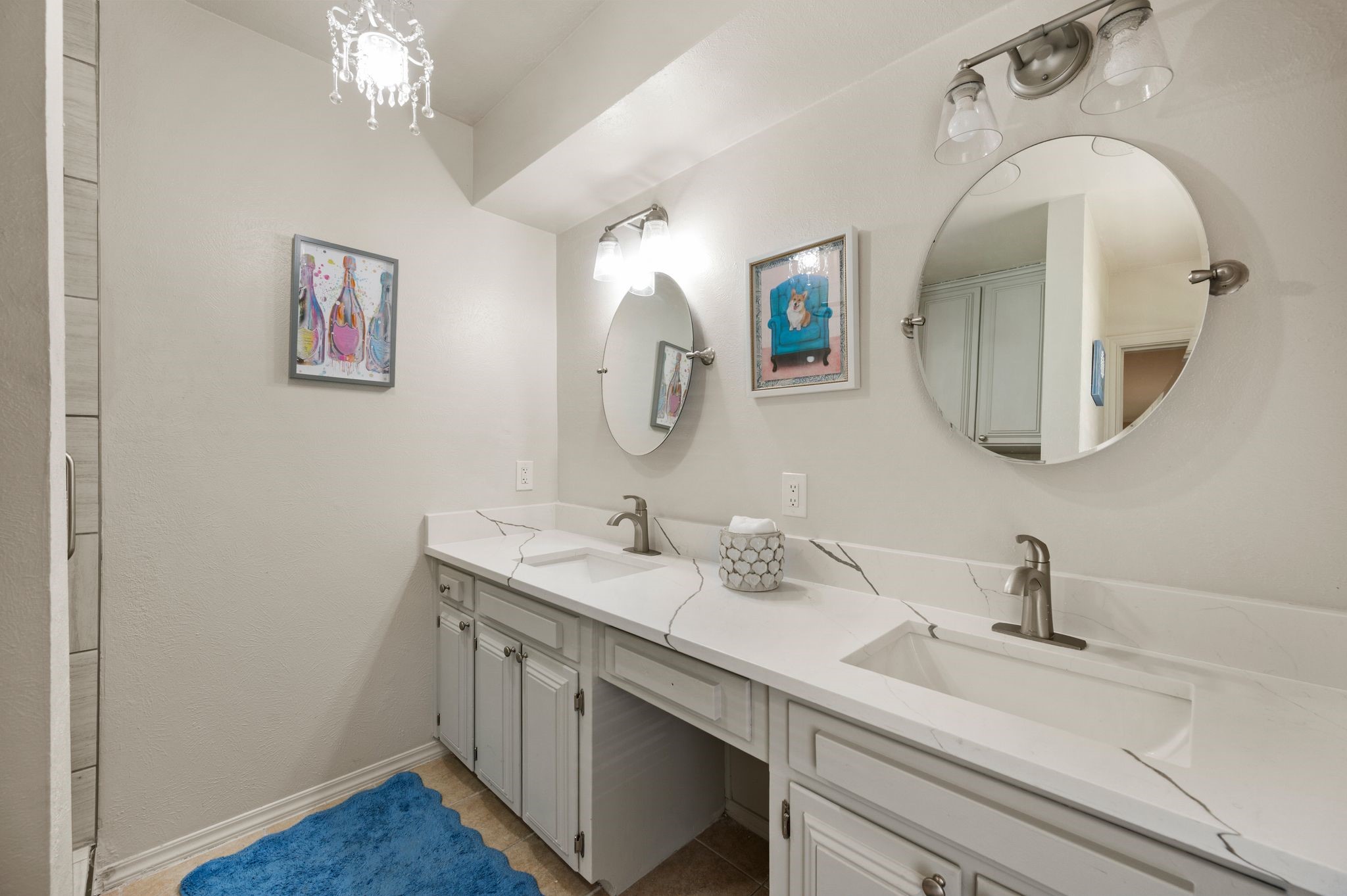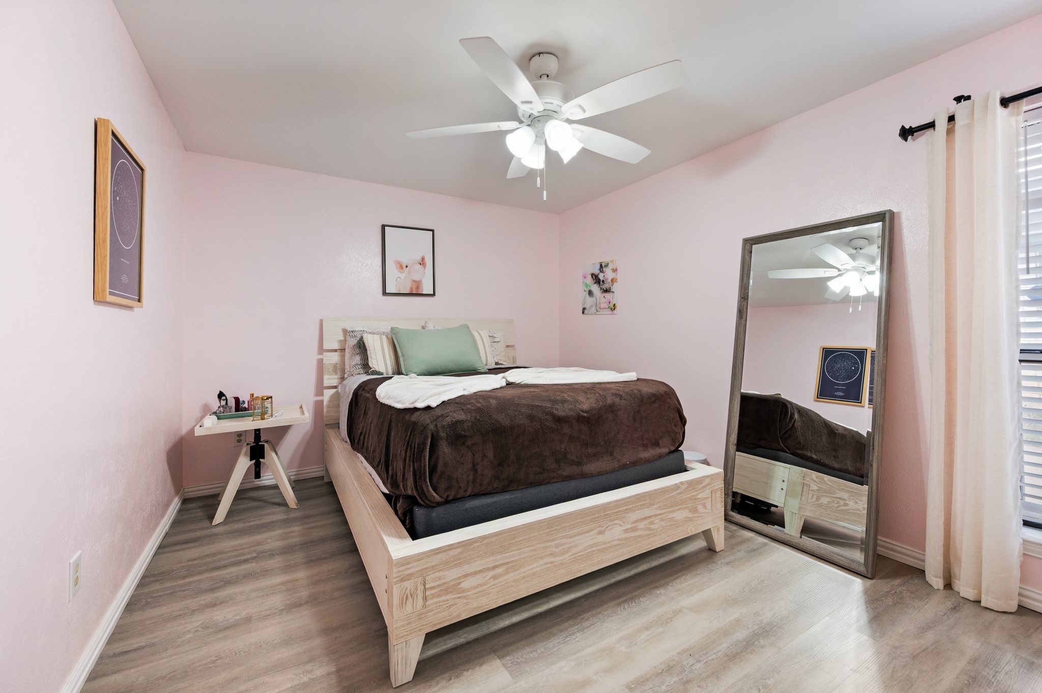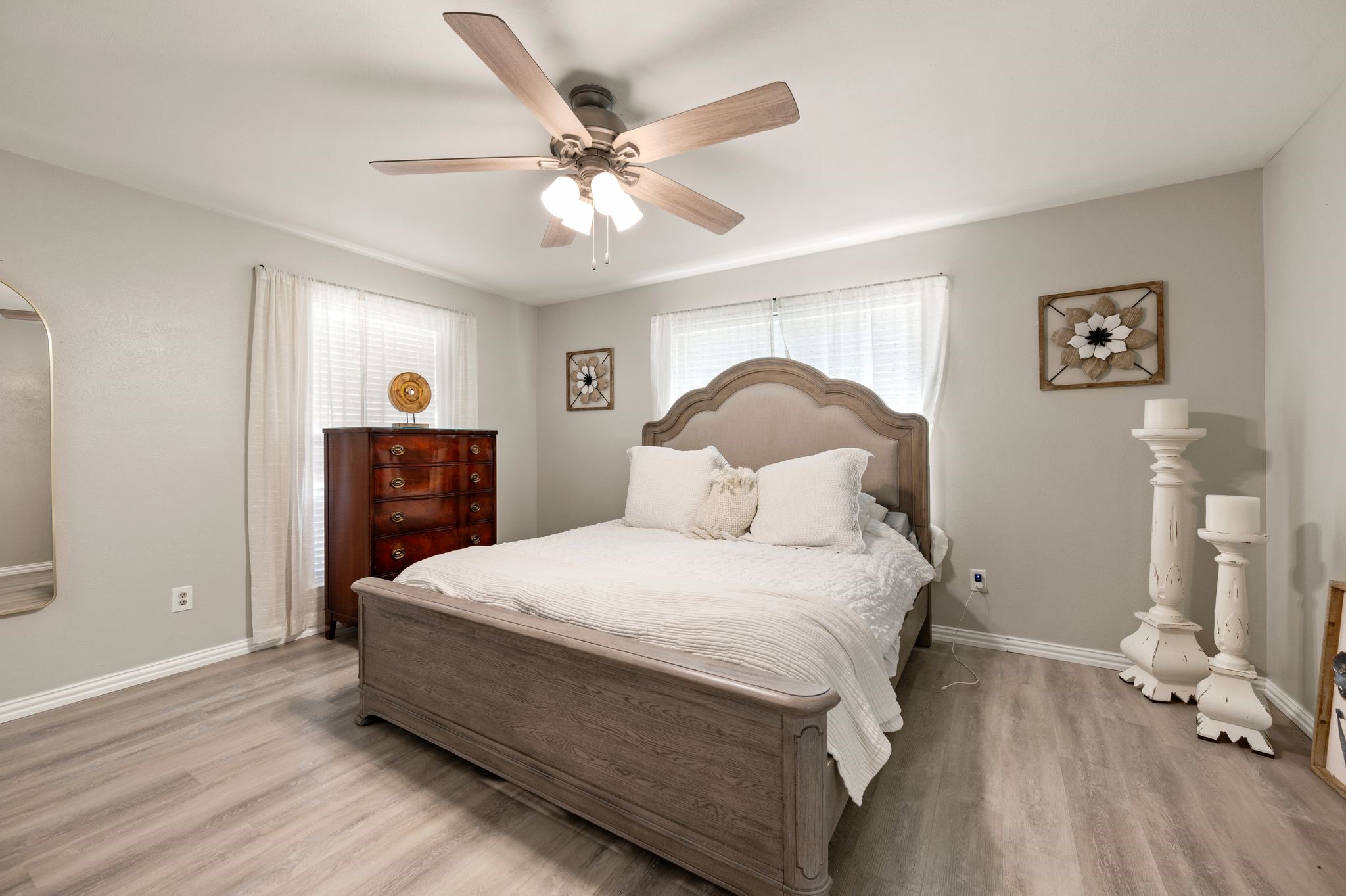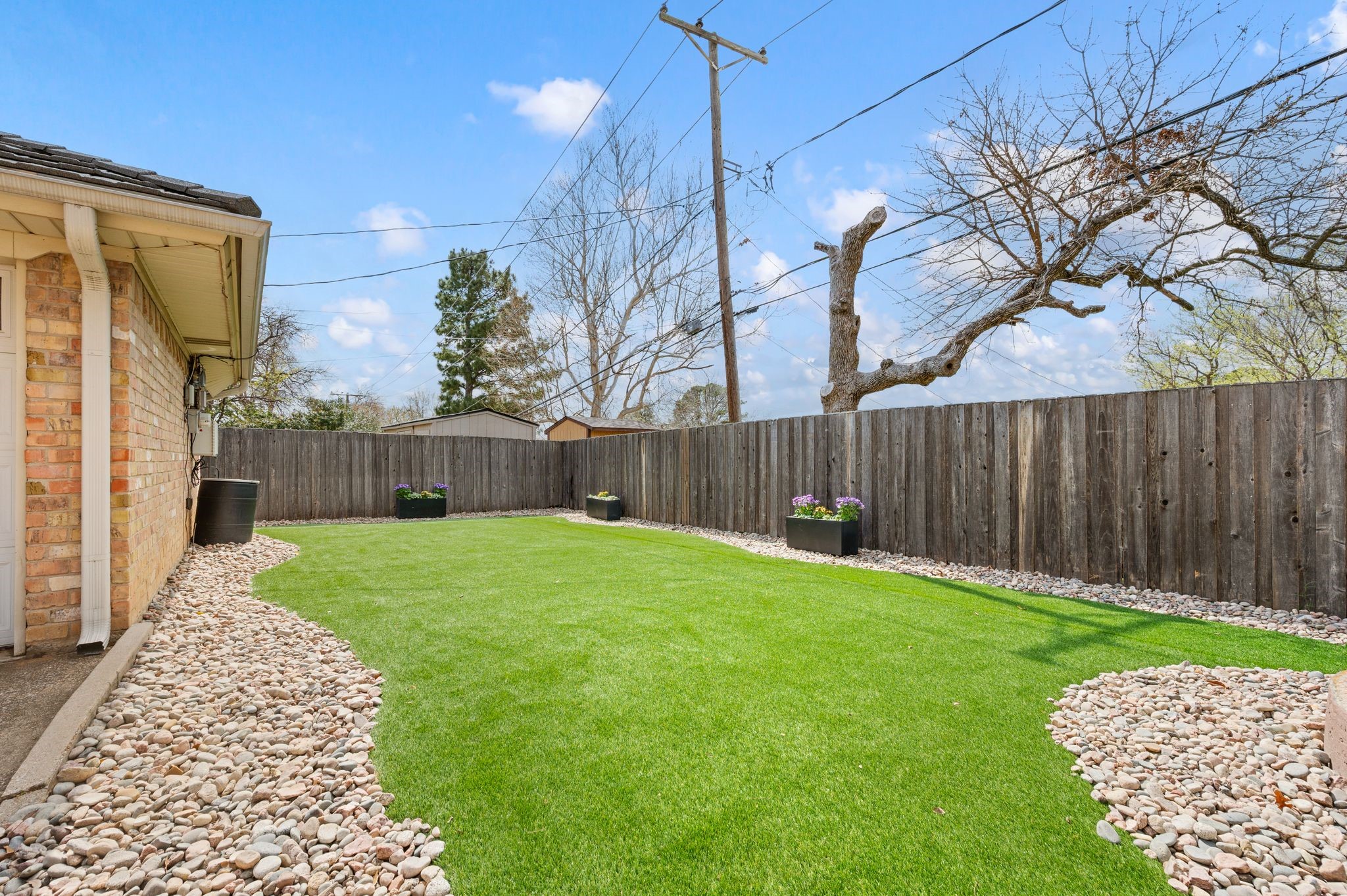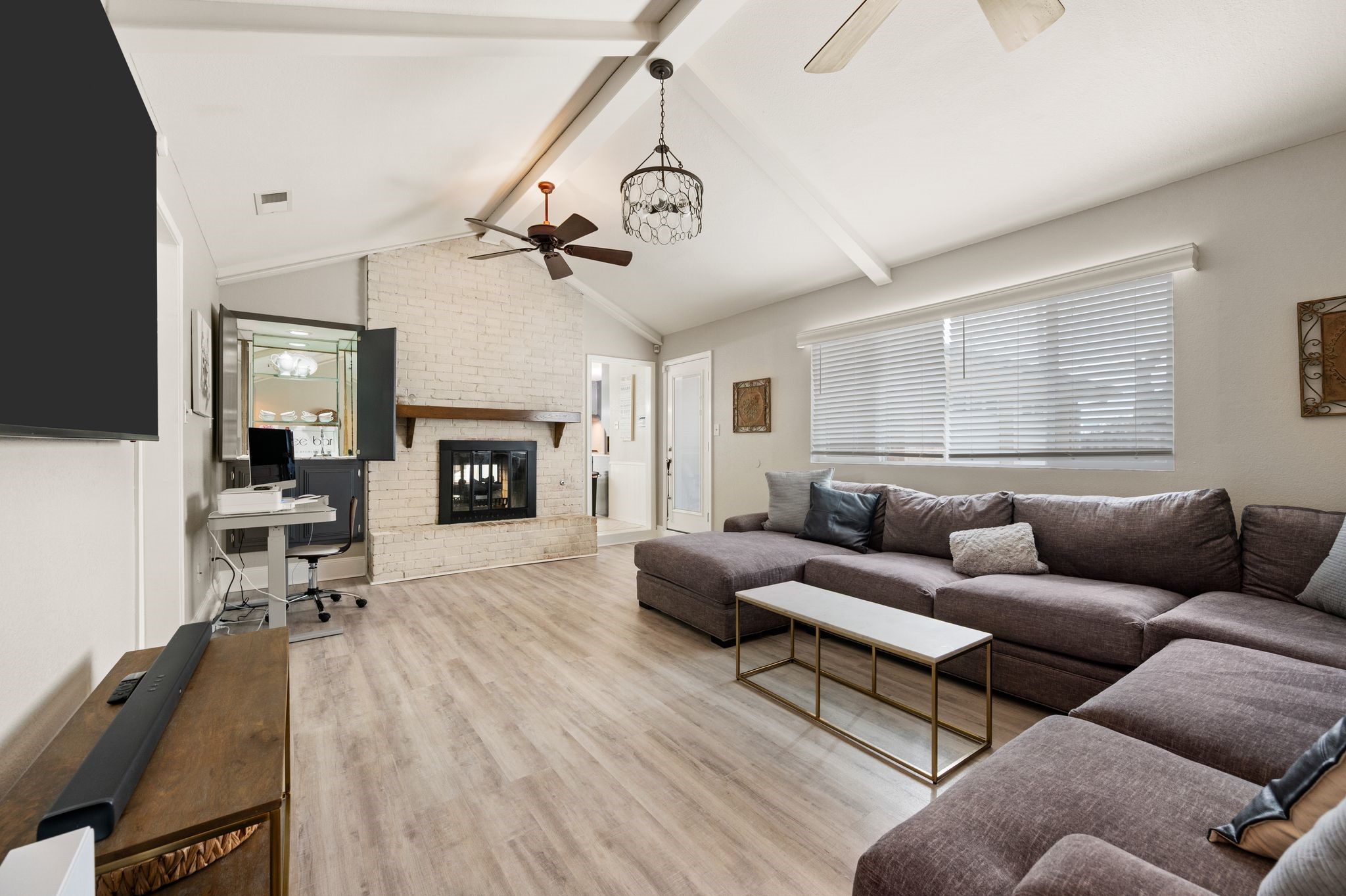 Welcome to this beautifully updated, truly turnkey one-story home nestled in the quiet and highly sought-after Mayfair community, just blocks from Chisholm Park and a variety of shopping and dining options. From the moment you arrive, fresh landscaping and a charming front porch create inviting curb appeal and the perfect place to relax while enjoying the lush green front yard. Inside, the home showcases stylish updates throughout, including new luxury vinyl plank flooring, fresh interior paint, and updated decorative lighting. The spacious living room is anchored by a stunning see-through brick fireplace that adds warmth and character while connecting the main living areas. The open eat-in kitchen shines with brand-new countertops, stainless steel appliances, and abundant built-in cabinetry that provides both functionality and generous storage. The thoughtfully designed split-bedroom floor plan offers privacy and flexibility for everyday living. Step outside to the covered patio, ideal for relaxing or entertaining, while overlooking the spacious backyard with newly added landscaping and fresh sod. Additional features include expansive private parking secured by an electric gate and the added peace of mind of a built-in storm shelter. Thoughtfully updated and completely move-in ready, this home blends comfort, style, and convenience in an unbeatable location.