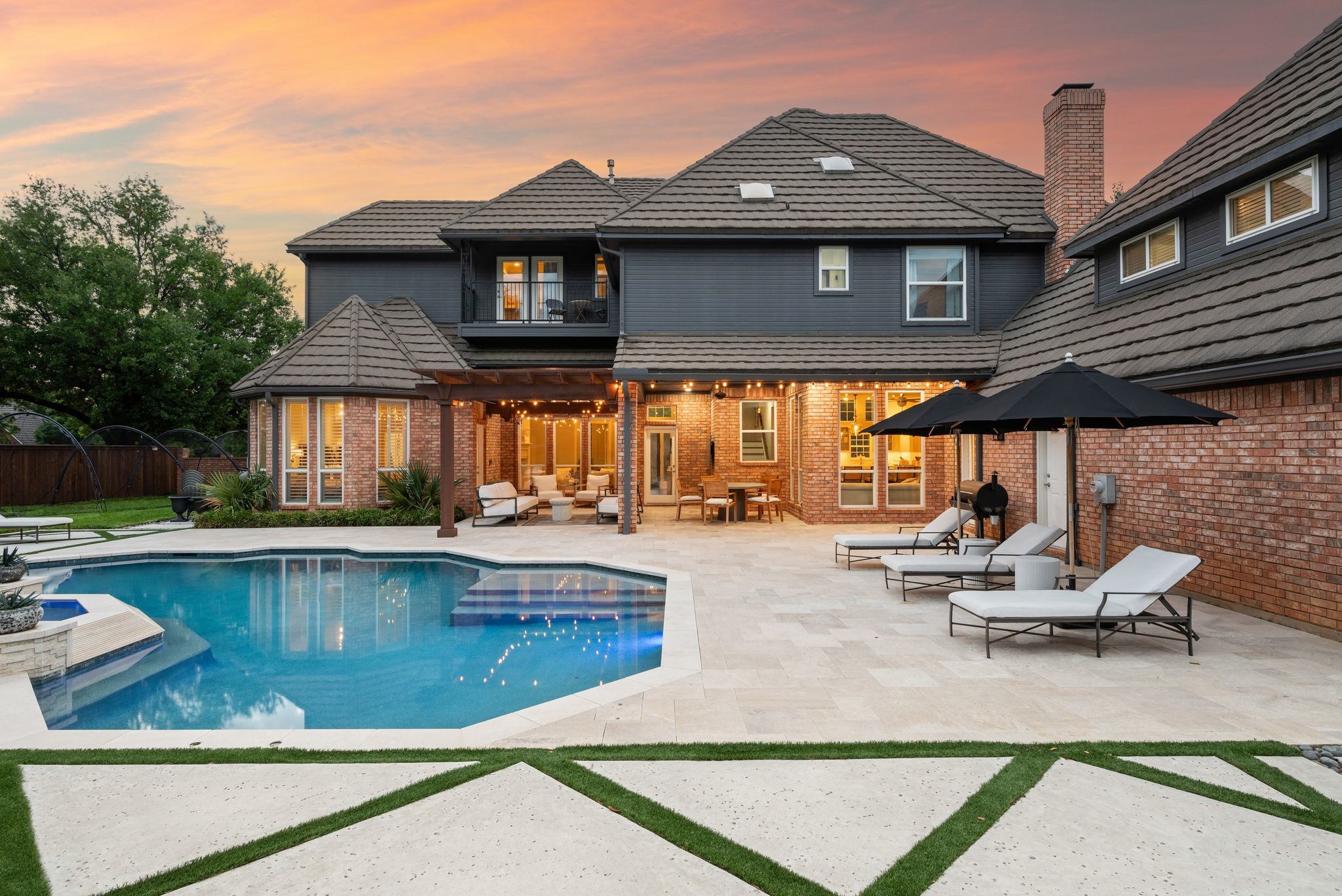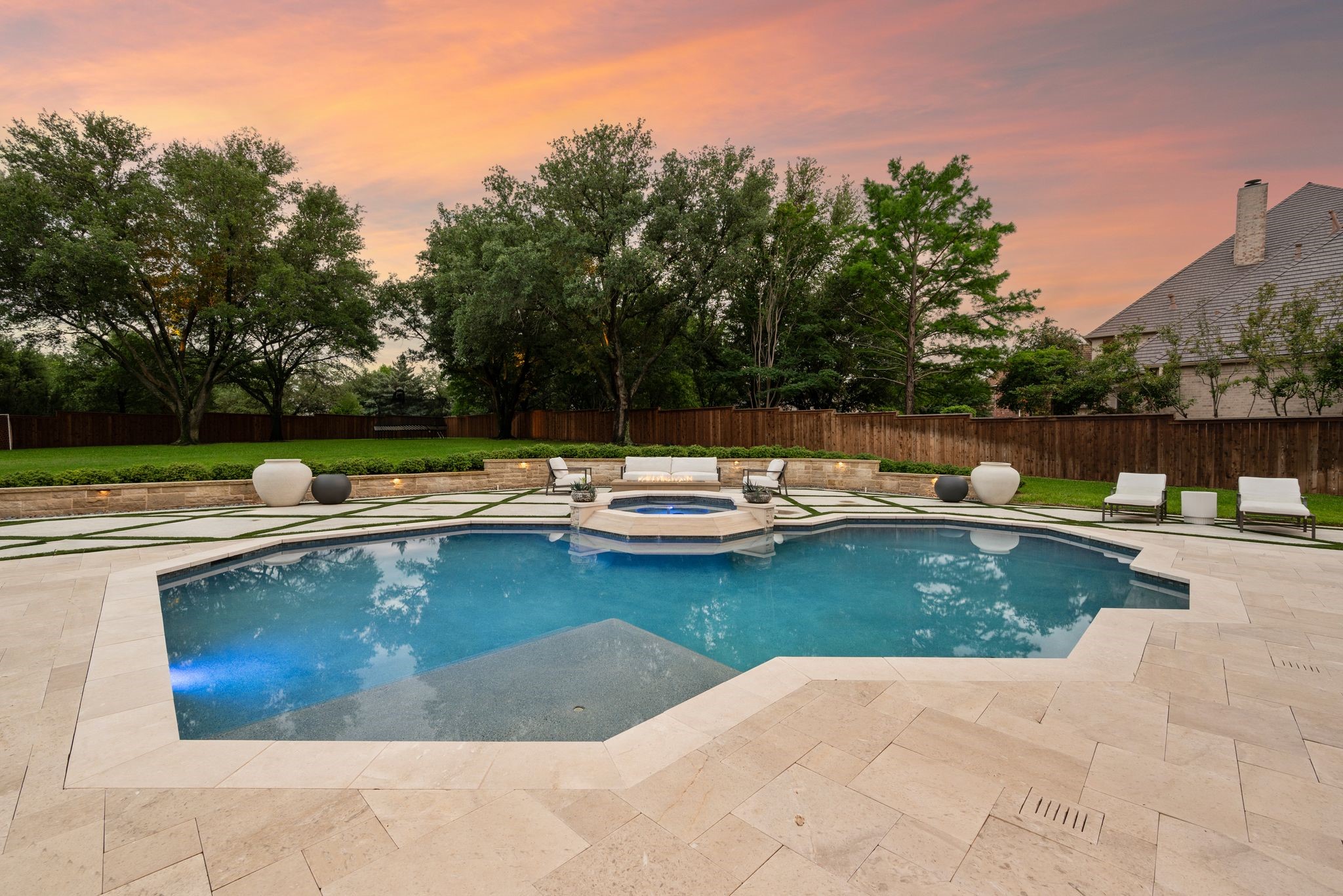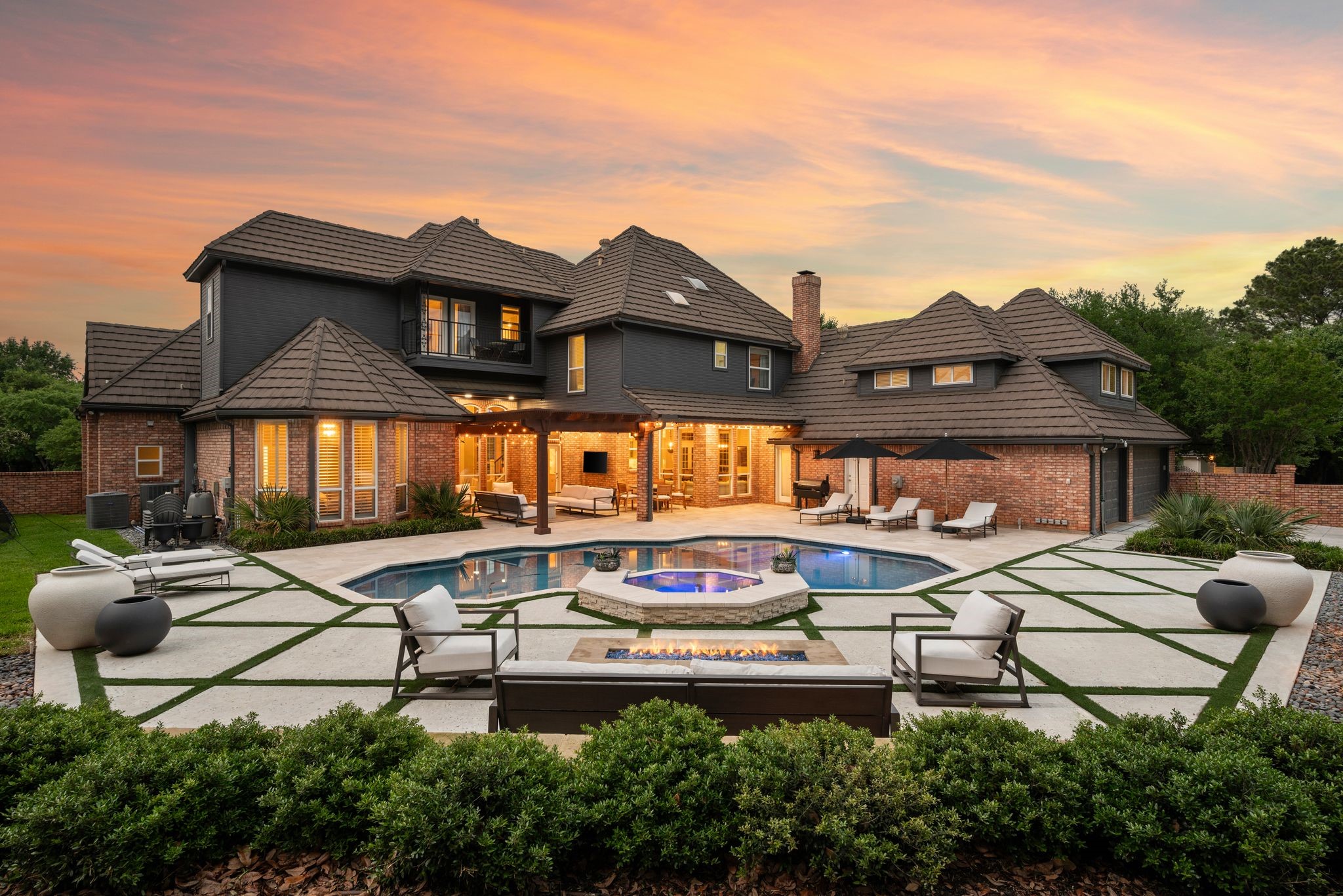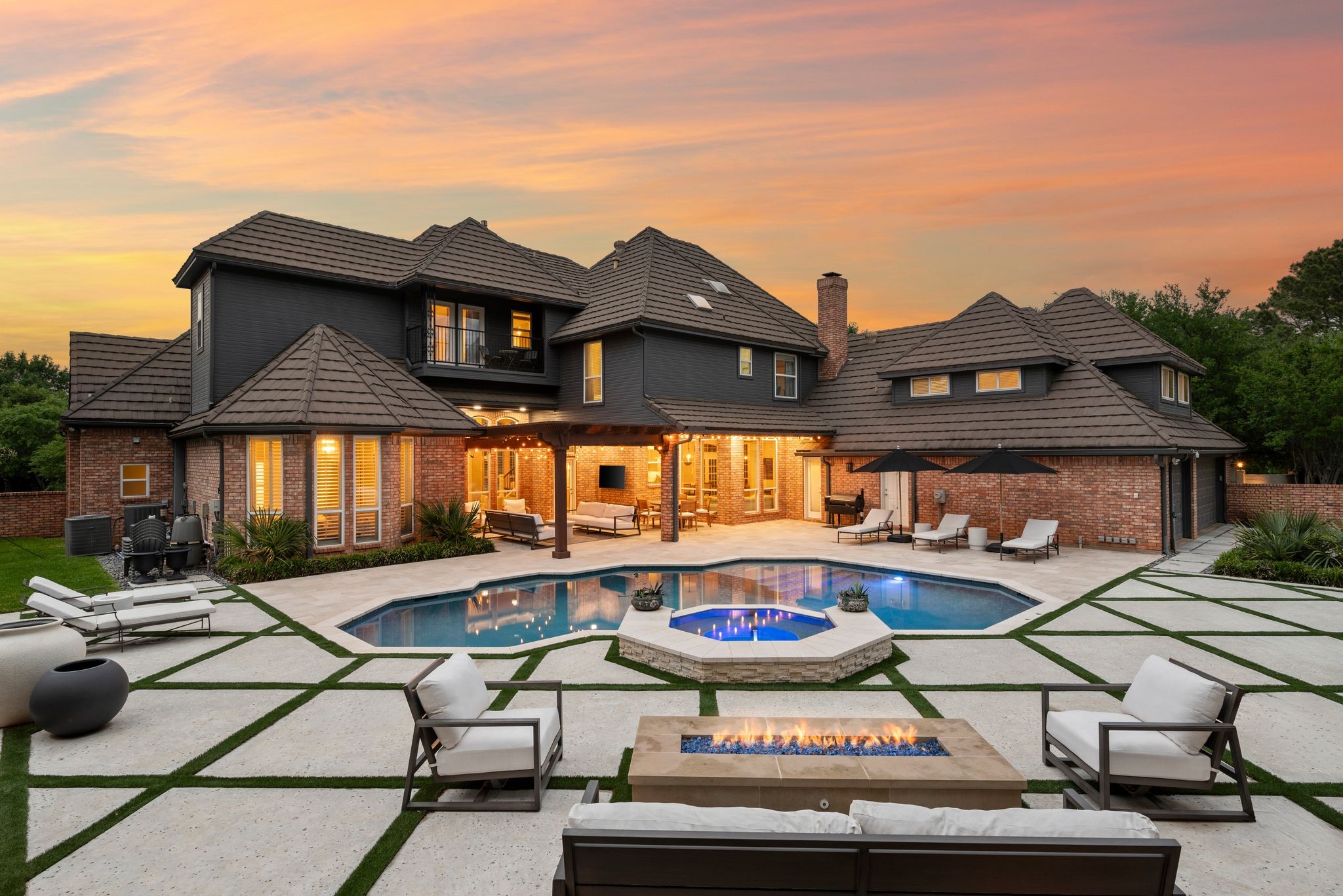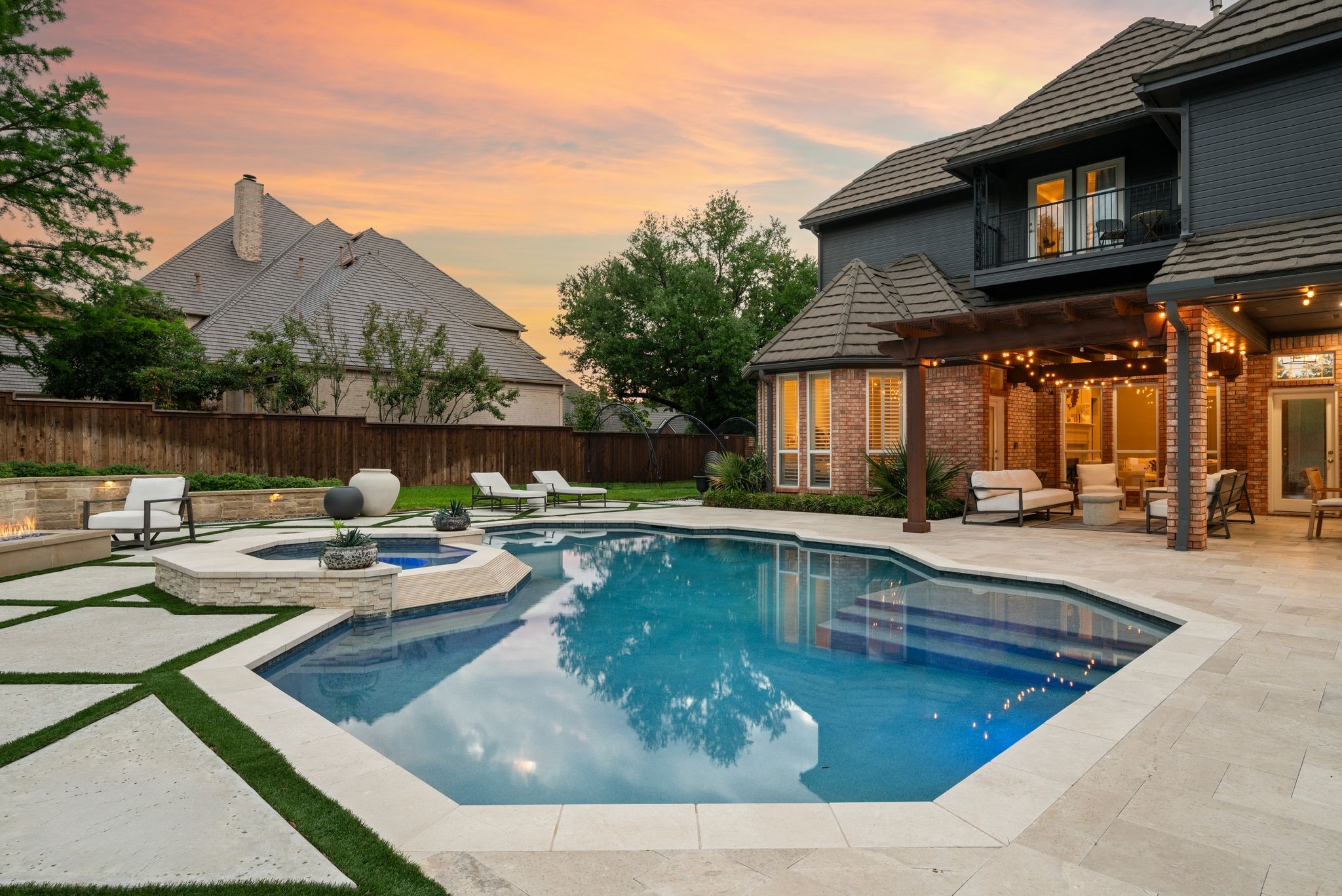 No expense was spared when it comes to the interior & exterior renovations completed for this stunning Colleyville home nestled on a rare 0.8-acre corner lot in the prestigious gated community of The Hills of Central Park. Perfectly located within the highly sought-after GCISD school district and just blocks from premier shopping, dining and DFW Airport, this home offers both convenience and elegance. Step inside and be welcomed by beautiful flooring, custom lighting, plantation shutters, crown molding & fireplace! The private office with custom built-ins offers an ideal environment for working from home or creating your own library retreat. Multiple living areas provide comfort and versatility, while the fully remodeled chef's kitchen shines with high end quartz countertops, dual islands, double oven, gas cooktop, custom cabinets, gorgeous backsplash and tons of natural light! The thoughtful layout includes the primary suite and a secondary bedroom with full bath on the main level! Do not miss the primary bathroom, which has been renovated with updated tile, designer lighting, leathered quartz countertops, waterfall shower with frameless glass & freestanding tub! Upstairs features three additional bedrooms, a spacious game room, and a flex space that could be turned into a wonderful media room, second office or a craft space! The outdoor space is an entertainers dream & feels like your own private resort-style oasis! As you walk into the backyard you will notice the updated pool decking, extensive stonework, travertine hardscape, smart system custom lighting and pool controls, covered patio, pergola, re-designed pool + spa, custom firepit and incredible amount of space roam and play. The board on board cedar fence creating ample privacy completes the package! If you are looking for the MOVE-IN READY Colleyville experience, this home truly has it all!