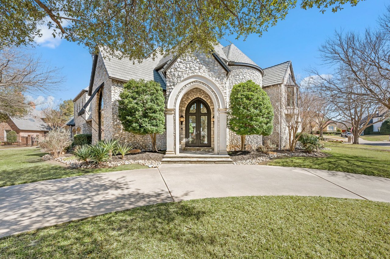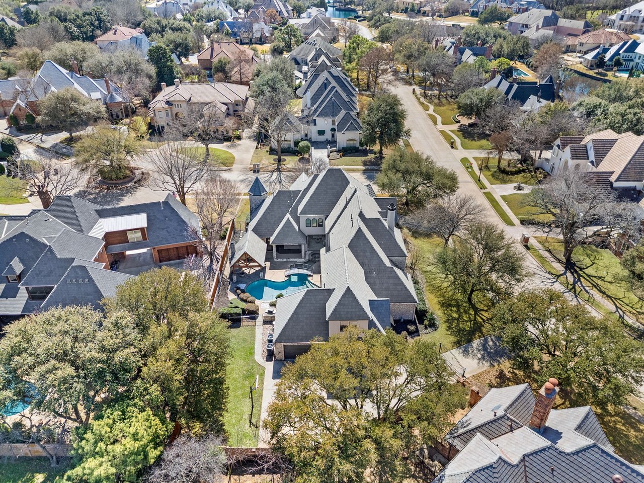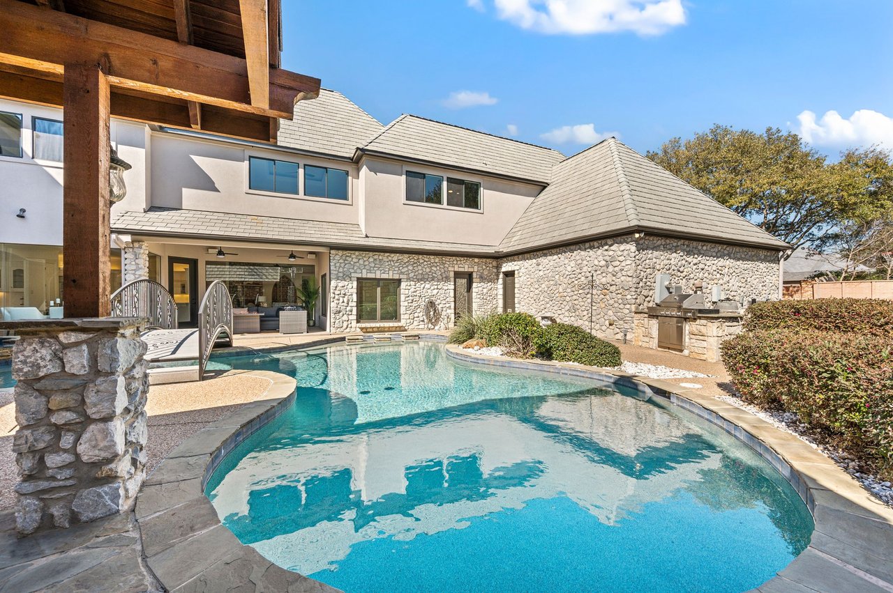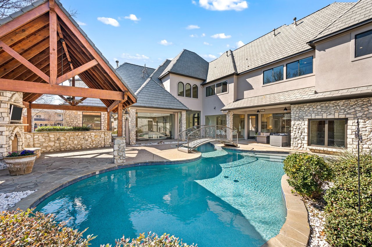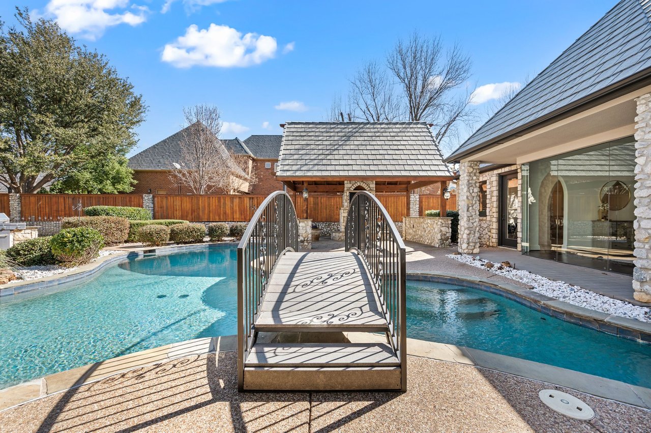 Welcome to this stunning, MOVE-IN READY luxury estate situated on a private half-acre corner lot in the prestigious 24-hour guard-gated community of Montclair Parc. Ideally located just minutes from premier shopping, dining, and a quick commute to DFW Airport. From the moment you enter, the grand wrought-iron staircase, soaring vaulted ceilings, and expansive windows create a breathtaking first impression, filling the home with natural light. Designed for elevated living and effortless entertaining, the first floor offers multiple living and dining spaces, an impressive media room, a walk-in wine room, dual butler’s pantries, and a spacious laundry room complete with built-ins and a pet shower. The chef’s kitchen is a true showpiece, featuring new quartz countertops, a built-in refrigerator, chef-style gas cooktop, and an oversized island perfect for gathering. The private primary suite is thoughtfully located on the main level and showcases a wall of windows overlooking the sparkling pool, a cozy double-sided fireplace, and an expansive custom walk-in closet with built-in shelving and vanity. The spa-inspired primary bath includes a soaking tub, built-in desk, and a luxurious oversized shower with multiple shower heads for a true retreat experience. Upstairs, enjoy a spacious game room with wet bar, a dedicated office with custom built-ins, and a generously sized secondary primary suite, ideal for multigenerational living or extended guests. Step outside to your own private resort. The covered patio overlooks a spectacular pool with a swim-up bar, while a charming bridge leads to a pergola with a fireplace. A built-in grill completes the outdoor living experience, creating the perfect setting for unforgettable gatherings year-round. You don't want to miss your chance for luxury and resort-style living, all in one remarkable property.