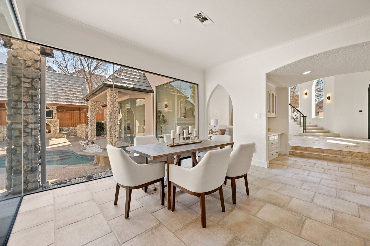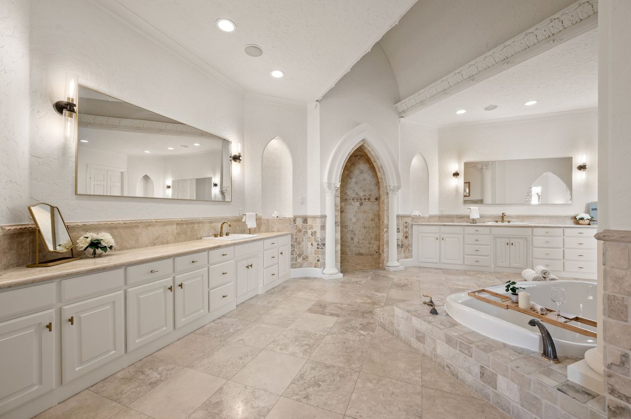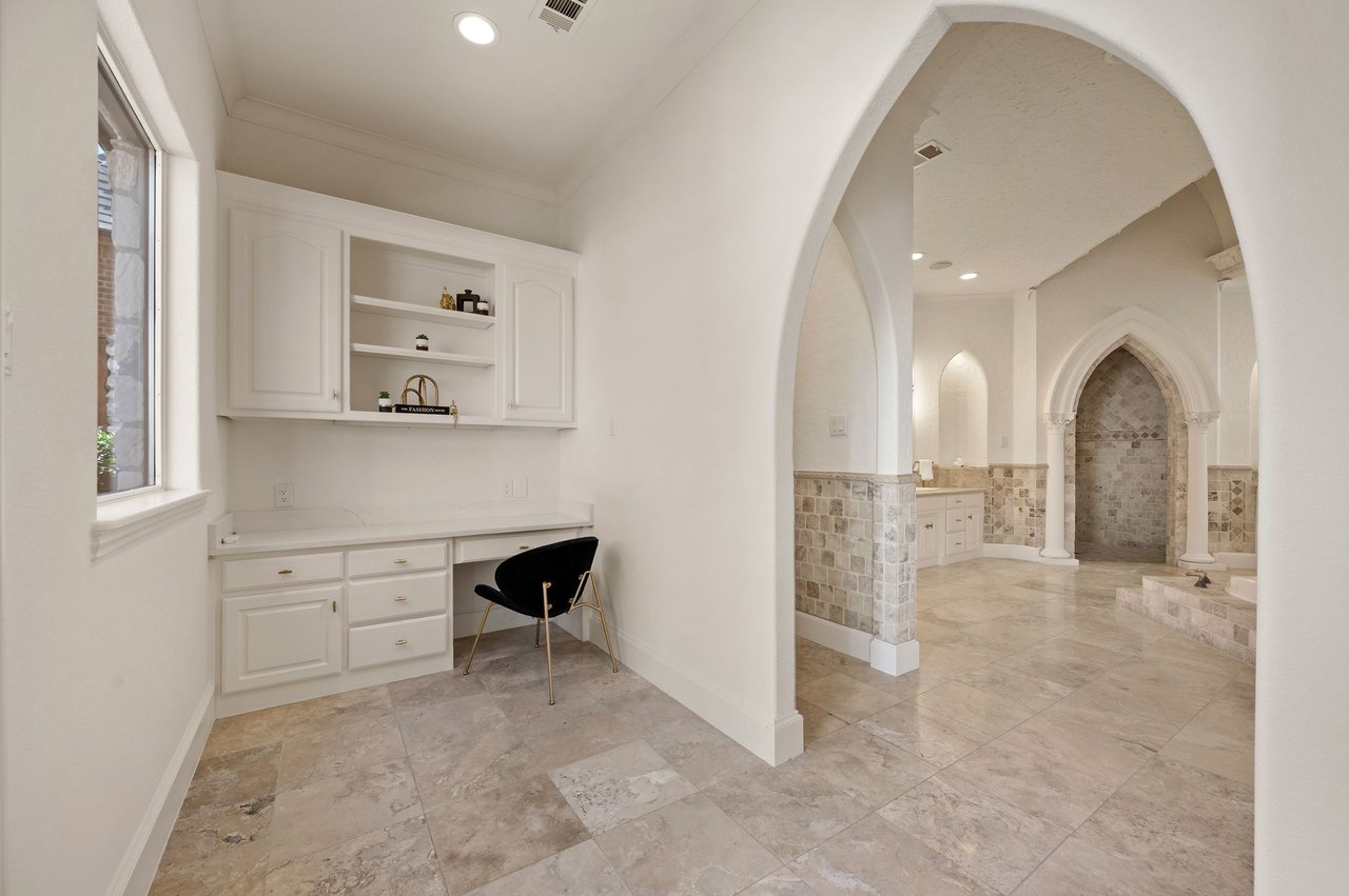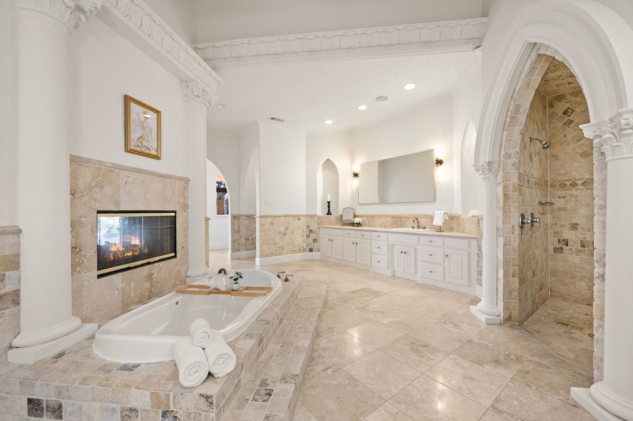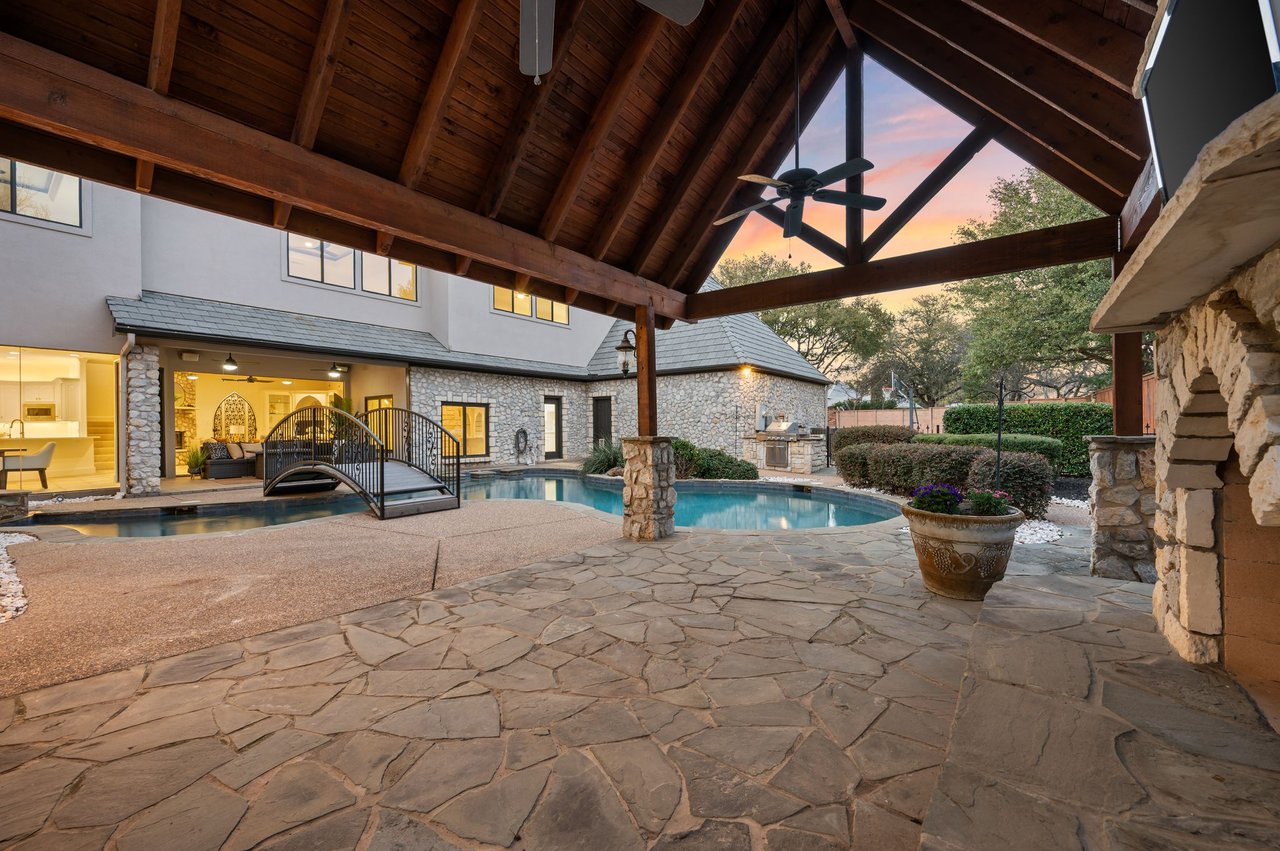 Welcome to this stunning, MOVE-IN READY luxury estate situated on a private half-acre corner lot in the prestigious 24-hour guard-gated community of Montclair Parc. Ideally located just minutes from premier shopping, dining, and a quick commute to DFW Airport. From the moment you enter, the grand wrought-iron staircase, soaring vaulted ceilings, and expansive windows create a breathtaking first impression, filling the home with natural light. Designed for elevated living and effortless entertaining, the first floor offers multiple living and dining spaces, an impressive media room, a walk-in wine room, dual butler’s pantries, and a spacious laundry room complete with built-ins and a pet shower. The chef’s kitchen is a true showpiece, featuring new quartz countertops, a built-in refrigerator, chef-style gas cooktop, and an oversized island perfect for gathering. The private primary suite is thoughtfully located on the main level and showcases a wall of windows overlooking the sparkling pool, a cozy double-sided fireplace, and an expansive custom walk-in closet with built-in shelving and vanity. The spa-inspired primary bath includes a soaking tub, built-in desk, and a luxurious oversized shower with multiple shower heads for a true retreat experience. Upstairs, enjoy a spacious game room with wet bar, a dedicated office with custom built-ins, and a generously sized secondary primary suite, ideal for multigenerational living or extended guests. Step outside to your own private resort. The covered patio overlooks a spectacular pool with a swim-up bar, while a charming bridge leads to a pergola with a fireplace. A built-in grill completes the outdoor living experience, creating the perfect setting for unforgettable gatherings year-round. You don't want to miss your chance for luxury and resort-style living, all in one remarkable property.